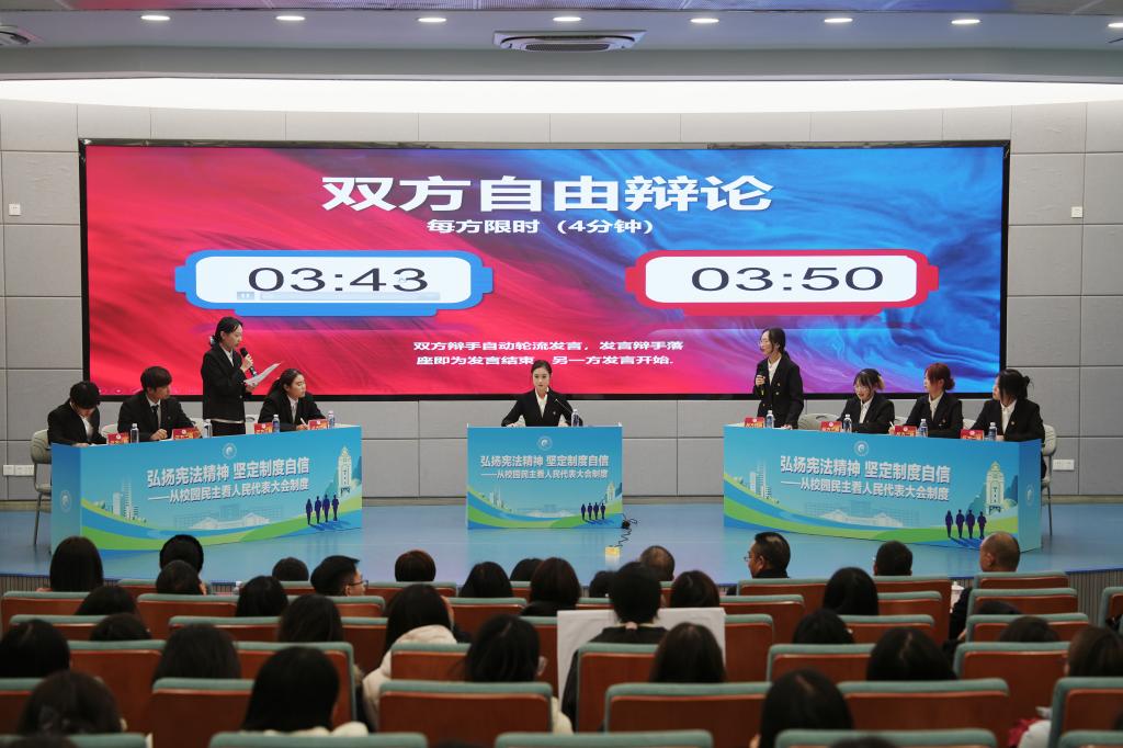 随后,学校开展了以“弘扬宪法精神,坚定制度自信——从校园民主看人民代表大会制度”为主题的思辨展演。我校学生围绕“校园民主与制度实践”展开思辨交流。双方辩手立足学习生活实际,就民主制度建设、公民权利义务等议题进行理性交锋。台下观众积极踊跃提问,代表们耐心解答,就大家关心的教育发展、青年成长、社会治理等问题进行了亲切交流,整个现场气氛活跃。人大代表勉励青年学子要坚定理想信念,主动学习宪法法律知识,积极参与社会实践,自觉将个人成长融入党和国家事业发展大局,做社会主义法治的忠实崇尚者、自觉遵守者、坚定捍卫者。