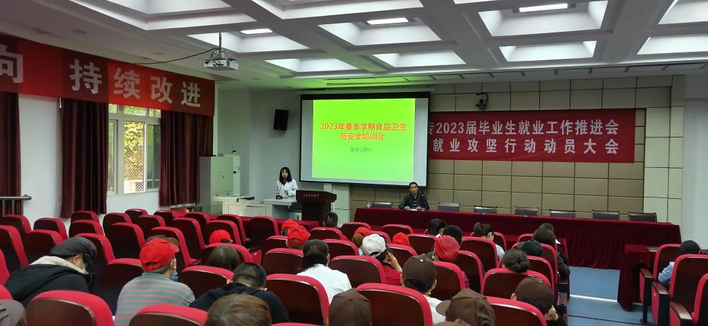 4月12日, 为进一步增强学校食堂食品从业人员安全意识,切实保障校园师生饮食安全,学校基建后勤处专门安排校医务室杨娟医生对学校食品安全管理人员、食堂从业人员进行了食品安全培训。