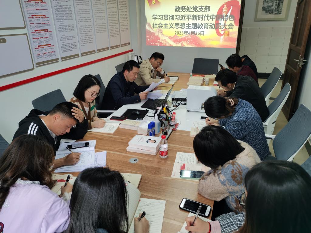 4月26日下午,教务处党支部在塘坊校区德馨楼209会议室召开学习贯彻习近平新时代中国特色社会主义思想主题教育动员会。会议由支部副书记谭伟同志主持,全体党员和入党积极分子参加会议。