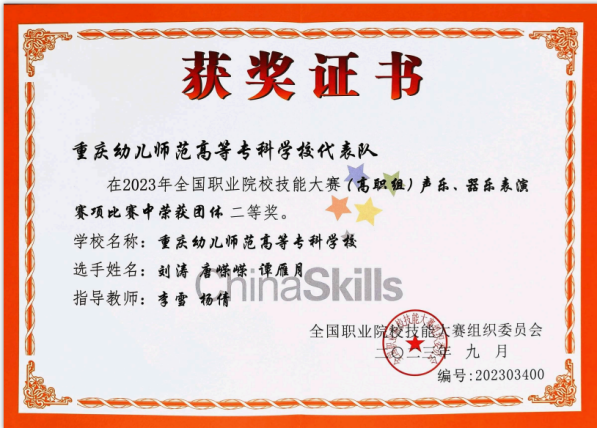 在刚刚结束的2023全国职业院校技能大赛声乐、器乐表演赛项中,我校音乐舞蹈学院刘涛、唐嵘嵘、谭雁月三名学生组建的团队荣获全国二等奖,成为唯一一所师范类专业学生获得二等奖的学校。