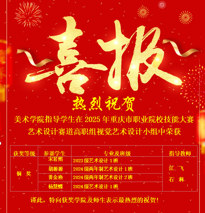 考务工作产教融合 当前位置: 首页 >> 产教融合 >> 正文 2025年重庆市职业院校技能大赛艺术设计赛道视觉艺术设计及数字艺术设计获奖喜报 更新时间:2026-01-20 12:59:49 信息来源: 浏览人数: 上一篇:深耕培育之路,赋能产教融合 ——我校成功举办现场工程师培养项目专题讲座 下一篇:2025年重庆市职业院校技能大赛教育与体育赛道中职组婴幼儿保育获奖喜报