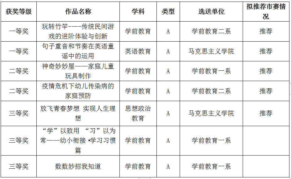 此次比赛共收到5个系部选送的作品14件。教务处组织校外专家分别对14件作品进行网络评审,通过专家们科学、公平、公正的评审,最终有7件作品在此次比赛中脱颖而出,获得校级奖项,其中一等奖2件,二等奖2件,三等奖3件。根据《重庆市教育委员会关于举办第六届高校微课教学比赛的通知》(渝教高函〔2020〕10号)要求,我校择优推荐了《玩转竹竿----传统民间游戏的进阶体验与创新》《句子重音和节奏在英语童谣中的运用》等5件作品参加市级评选。