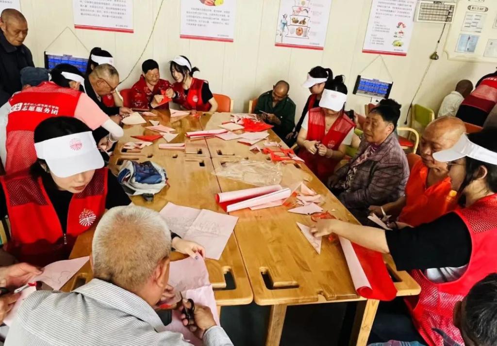 以李河镇社区舞蹈队精心编排的舞蹈拉开活动序幕。随后,师生们结合专业特长,以“敬老爱老”为主题,描绘的画作取材于著名画家丰子恺先生的作品,同学们用画笔描绘敬老情,用色彩点亮敬老院,为院内增添了无限的生机与活力。最后,师生们采取一对一的方式陪伴老人,教授老人们剪纸的艺术,在共同协作下完成一幅幅精美的剪纸作品,笑容洋溢在每位老人的脸上,感受着陪伴的幸福与喜悦。