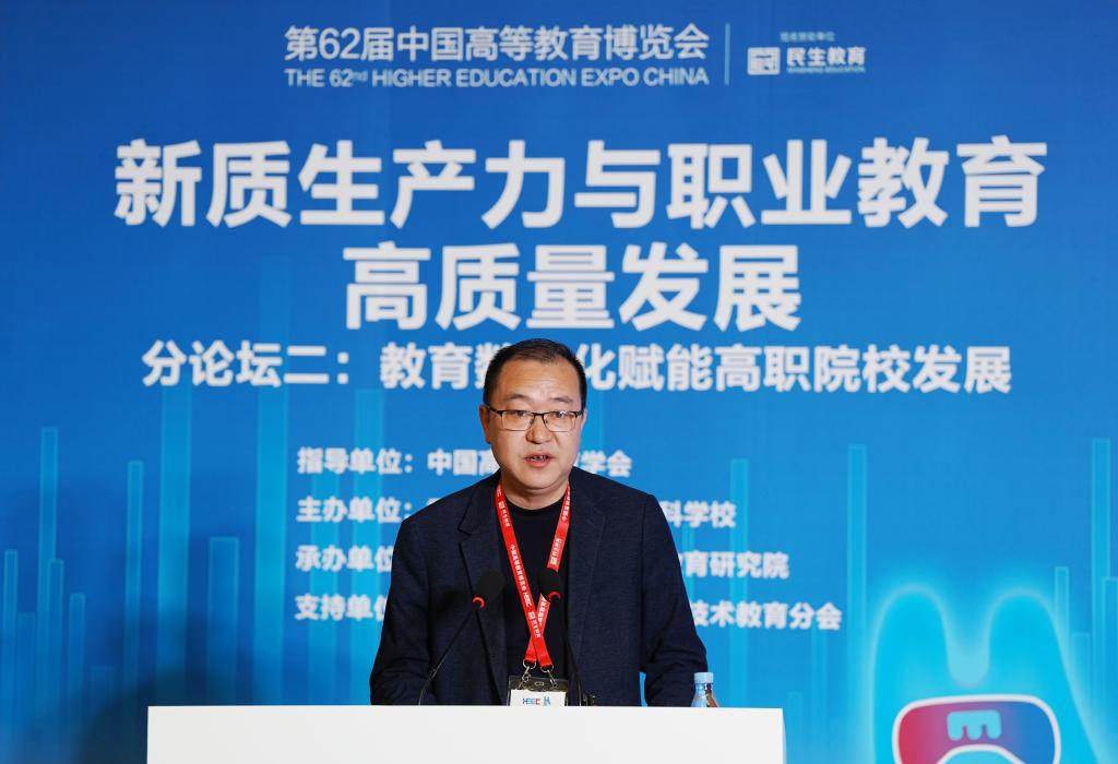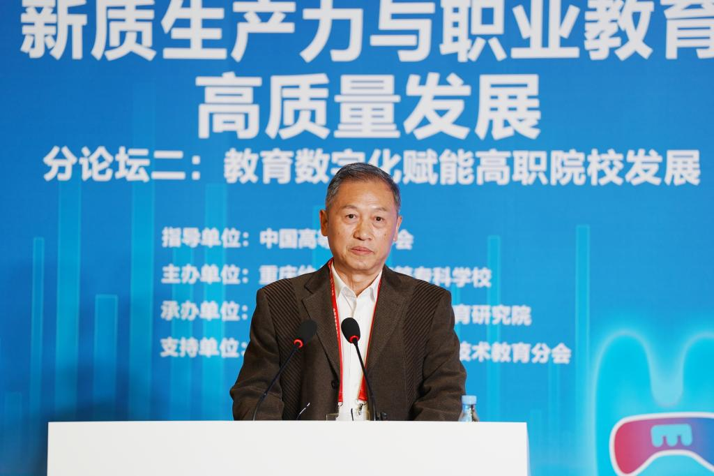 重庆市高等教育学会副会长黄宗明代表重庆市高等教育学会致辞。他表示,今天大家齐聚一堂,共同探索高等职业教育数字化转型的路径,展望未来高职院校教育数字化发展的美好期许,是一次难得的交流和学习的机会。他指出,数字化是教育转型发展的基本要求,是推动学习型大国建设的重要途径,是落实科教兴国战略、实现教育现代化目标的重要基础,本次论坛以“教育数字化赋能高职院校发展”为主题,聚焦生成式人工智能、数字资源建设、AI赋能等前沿话题,探讨如何通过数字化手段提升高职院校教育质量、推动职业教育的内涵式发展,这一主题不仅契合了当前高等教育改革的方向,更是对未来高等教育发展模式的积极探索。希望通过本次论坛,汇聚各方智慧,共同探索教育数字化在高职院校中的深度应用与实践,携手共创教育数字化赋能高职院校发展新篇章。