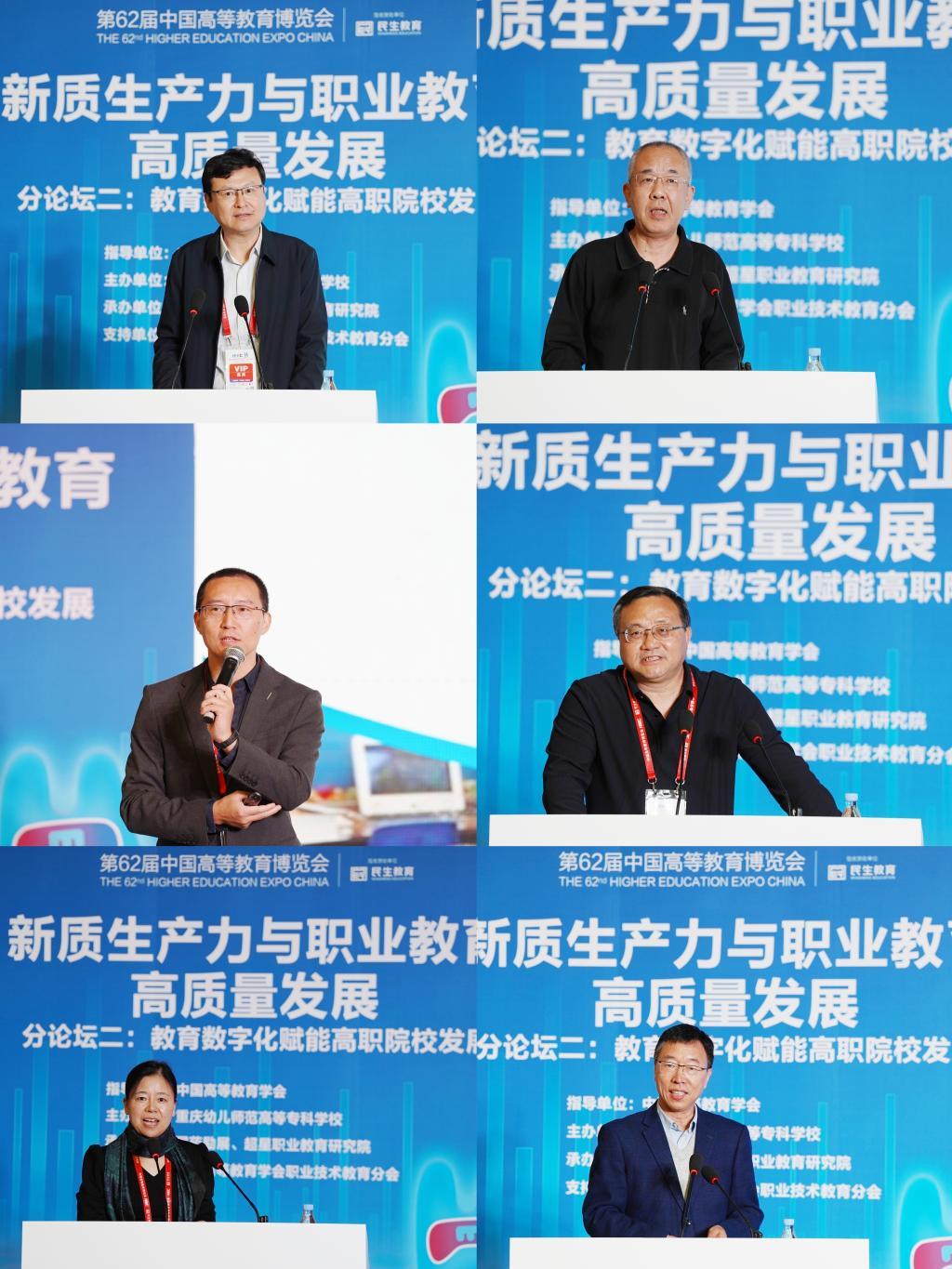 此次论坛共有6场专家讲座,在专家团队作主题分享阶段,西南大学教育学部教授、智慧教育重庆市高校工程研究中心主任刘革平作了《生成式人工智能支持的高职教学改革》主旨报告;教育部教育技术与资源发展中心(中央电化教育馆)职业教育发展处处长赵林以《职业教育数字化战略行动下的数字资源建设与应用》为题作了经验交流;华南师范大学教育信息技术学院教授、广东教育学会网络教育专业委员会秘书长汪晓东以《AI赋能高职教育课程改革与教学创新》为题作了经验分享;浙江工业大学教育科学与技术学院教授、长三角产教融合发展研究院副院长、浙江省高校教育技术学会副理事长朱敬东作了《AI赋能职业教育新型学习空间构建与应用》主旨报告;南京工业大学经济与管理学院教授、国家大学科技园创业教育实训基地主任周晓琛以《数字赋能职业院校教学改革的研究与探索》为题作了经验交流;教育部职业院校信息化教学指导委员会副主任、北京信息职业技术学院原副校长贾清水作了《AI赋能职业院校专业建设与课堂教学质量评价》主旨报告。