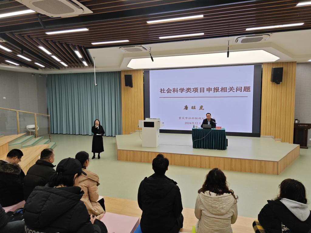 为做好2025年国家社科基金项目申报工作,切实提升我校教师项目申报的针对性和成功率,12月26日上午,科研处(学科建设办公室)在仁爱楼2201报告厅举行“2025年国家社科基金项目申报专题辅导会”。会议邀请了重庆市社科联党组成员、规划评奖办主任唐旺虎开展专题指导。副校长薛娟、副校长肖幸出席,各二级学院无课教师参加辅导会,副校长肖幸主持会议。