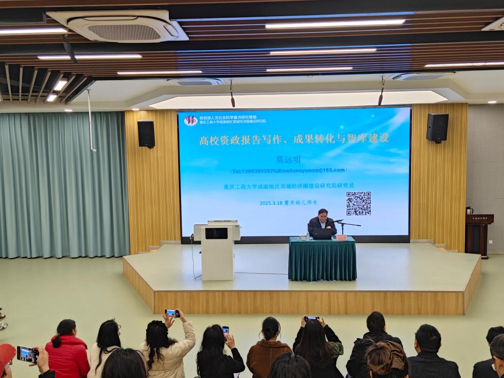 莫远明研究员以《高校资政报告写作、成果转化与智库建设》为题,以高校智库建设的战略机遇与发展走向、高校资政报告的政策依据与选题策划、高校资政报告的写作与成果转化技巧、提升重庆幼儿师专智库资政建言能力、打造重庆幼儿师专高水平标志性成果为内容,向教师们传授资政报告写作经验,以及成果转化与智库建设经验。