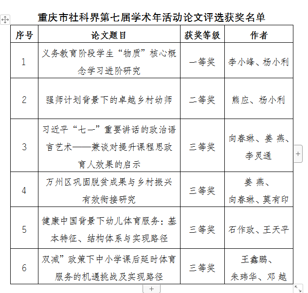 近日,重庆市社科联公布了重庆市社科界第七届学术年活动论文评选获奖结果。我校共有6篇论文获得奖励,其中一等奖1篇,二等奖1篇,三等奖4篇。