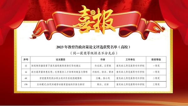 我校在重庆市教育委员会发布的《2023年教育咨政决策论文评选结果的通知》(渝教策函〔2023〕18号)中获悉,我校4篇教育咨政决策论文在评选活动中获奖。其中仵兆琪、王雪佩撰写的《短视频传播背景下重庆高校教育舆情引导的建议》,刘桂玲、徐浩、黄涛撰写的《助力高质量普惠托育:托育服务人才培育的镜鉴与策略》荣获一等奖,王曦、杨小利撰写的《学前教育机构分级分类评价系统构建策略》荣获二等奖,熊应、史妍撰写的《五向模式:协同共建劳动教育基地的价值与路径》荣获三等奖。