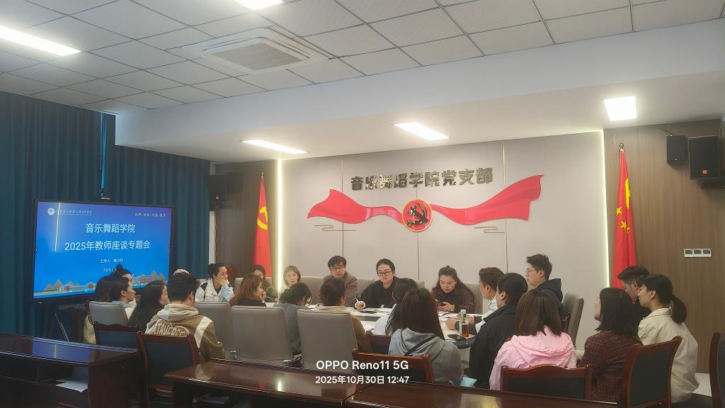 10月30日,音乐舞蹈学院在党员活动室召开2025年教师座谈专题会。学院党支部书记、各办公室办负责人、高层次人才教师代表、中青年教师代表、同工同酬教师代表、外聘教师代表和新进教师参会。会议由学院负责人崔小红主持。