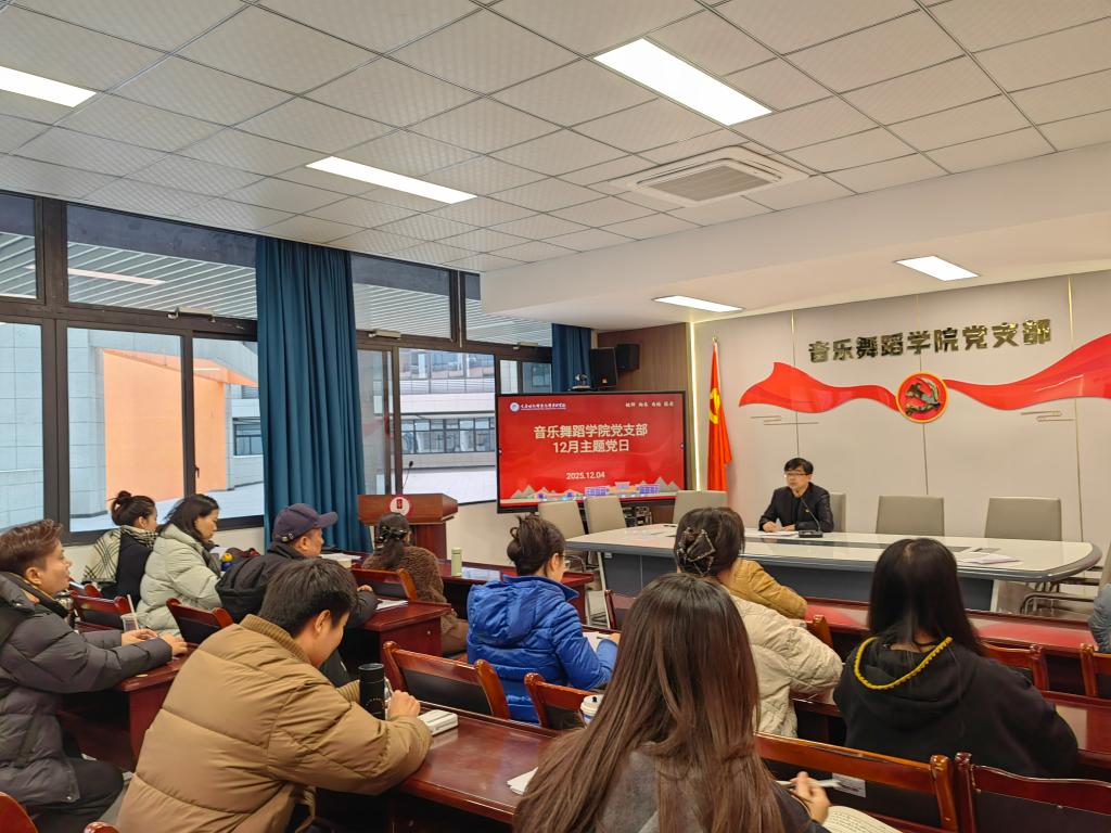 为深入学习贯彻党的最新精神,进一步增强党员的理论素养与使命担当,2025年12月4日,音乐舞蹈学院在学院党员活动室组织开展了十二月份主题党日活动。本次活动以“深学细悟全会精神 实干笃行担当使命”为主题,学院全体党员及预备党员参加,活动由学院党支部书记赵洪斌同志主持。