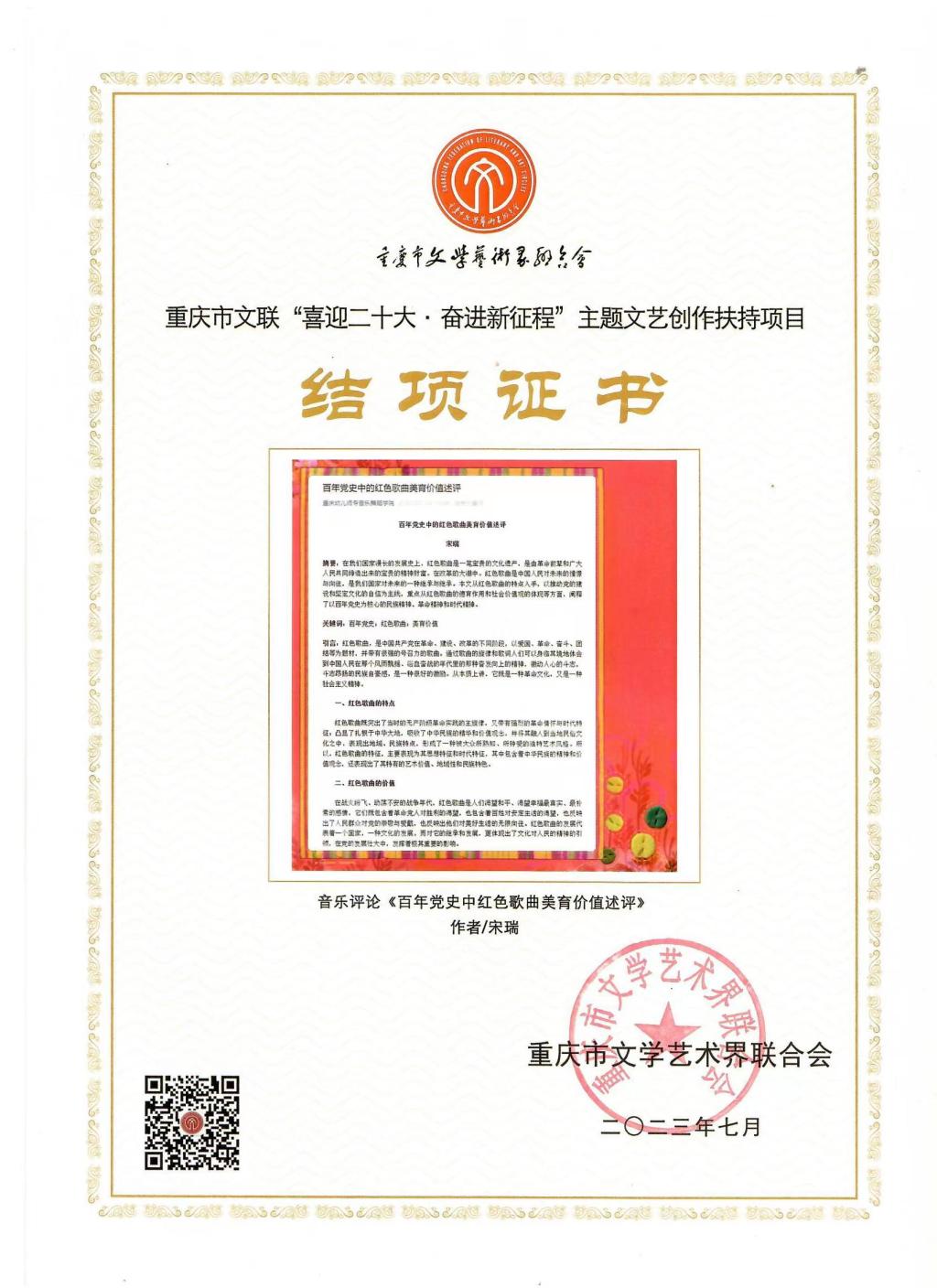 近日,音乐舞蹈学院承担的重庆市文联“喜迎二十大 奋进新征程”主题文艺创作扶持项目《百年党史中红色歌曲美育价值述评》成功结项。