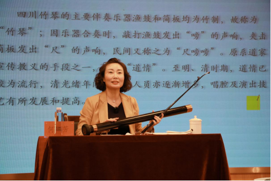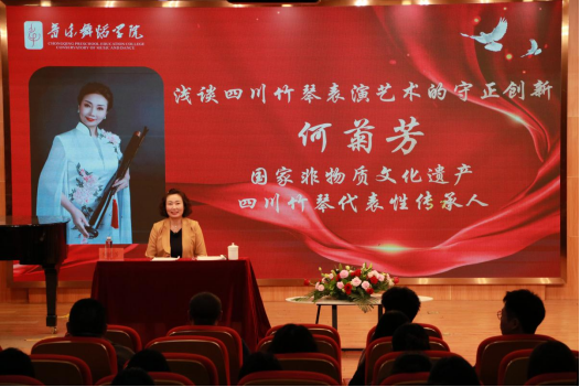 作为我国非物质文化遗产四川竹琴代表性传承人、国家一级演员、四川竹琴表演艺术的领军人物,何菊芳从四川竹琴的历史渊源、艺术特点、演唱技巧以及守正创新做了分享。现场,何菊芳以其扎实的专业功底,精妙的弹唱形式,将传统唱腔与时代元素的结合向在场师生诠释了四川竹琴的历史厚重感与独特韵味。