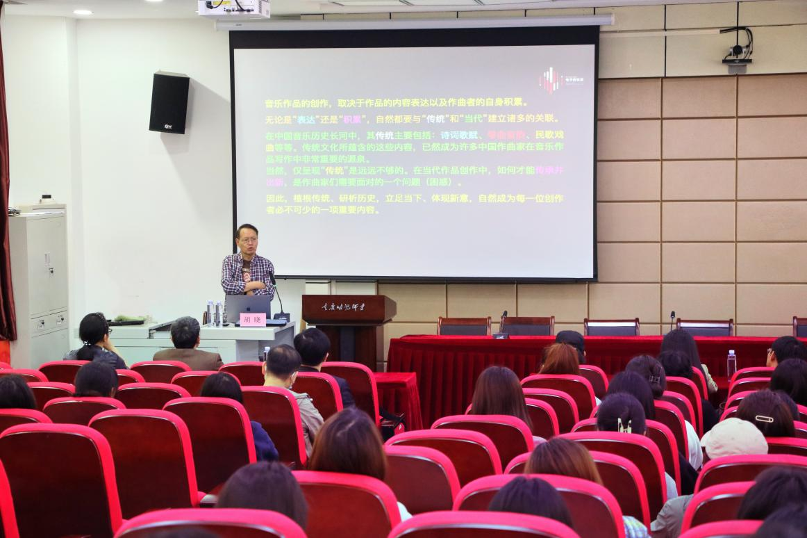 4月25日,音乐舞蹈学院邀请四川音乐学院作曲系胡晓教授,在仁爱楼宣讲大厅举办了一场主题为“传统意蕴·当代表达”的学术讲座。学院师生共200多人参加本次活动。