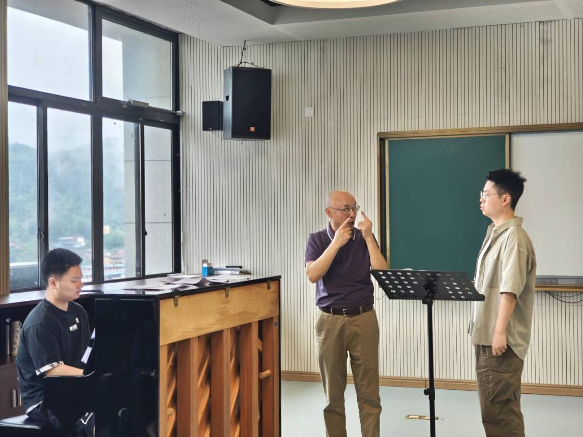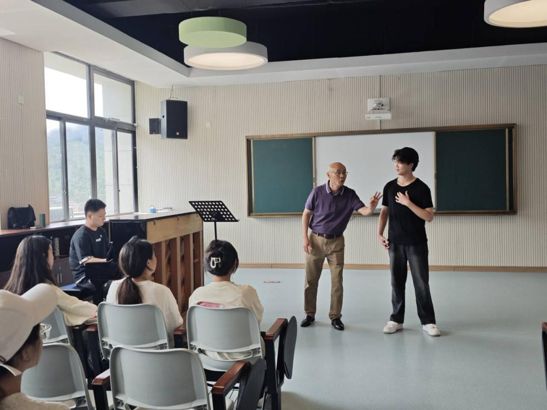 下午的学生教学环节,张教授针对卢煜辉、袁梦、李江涛、田雨、董阳成五名学生开展一对一声乐实训。张礼仁教授首先从学科本质出发,提出 "声乐艺术的双重属性论":"‘唱歌’是自然发声的本能表现,而‘歌唱’是融合技术规范、艺术理解与情感传递的系统性创造。作为未来的艺术教育工作者,必须以专业化训练夯实‘歌唱’根基,实现从声音使用者到艺术诠释者的认知跨越。" 这一论断为学生明确了职业发展的核心定位。