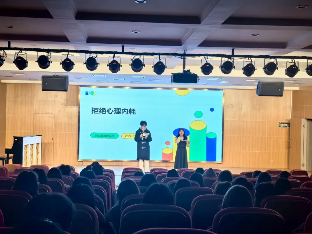 精彩的开场舞《BACK SEAT》点燃了整堂班会的气氛,同学用活力四溢的舞蹈表达了对健康心态的追求。接着主讲人结合图表详细为同学们讲解了心理内耗产生的原因以及心理内耗带来的不良影响。