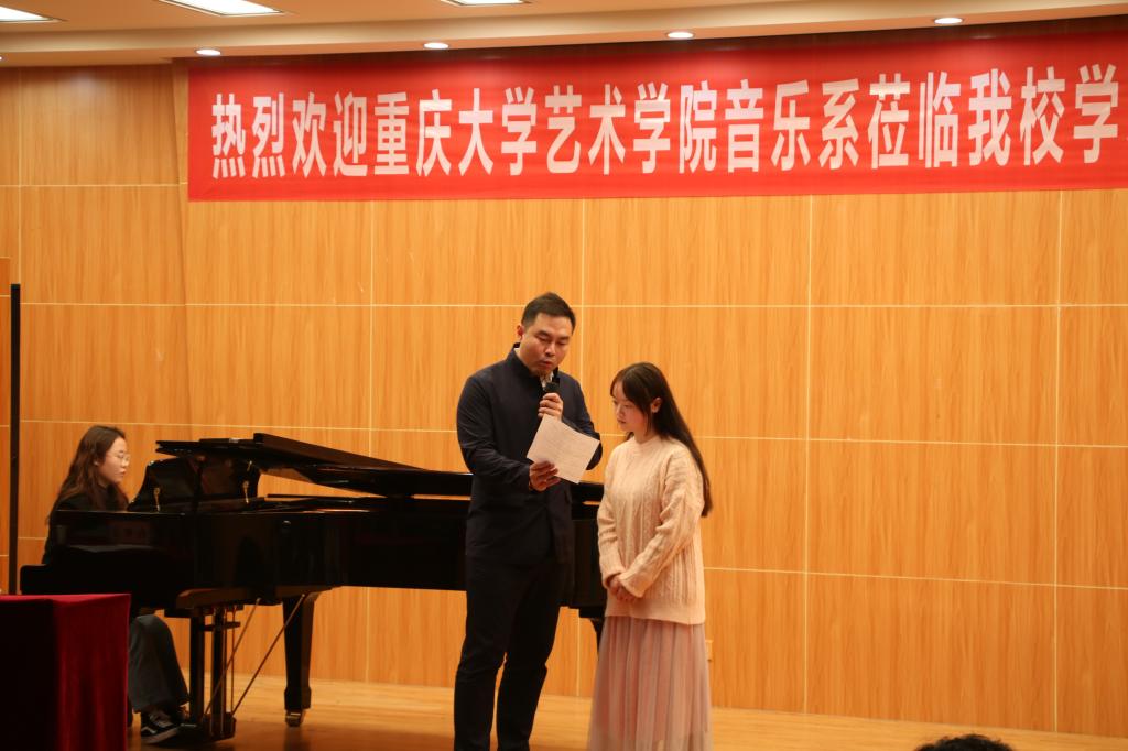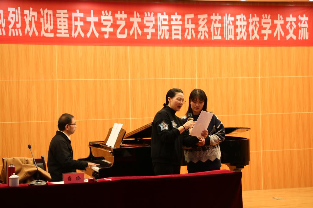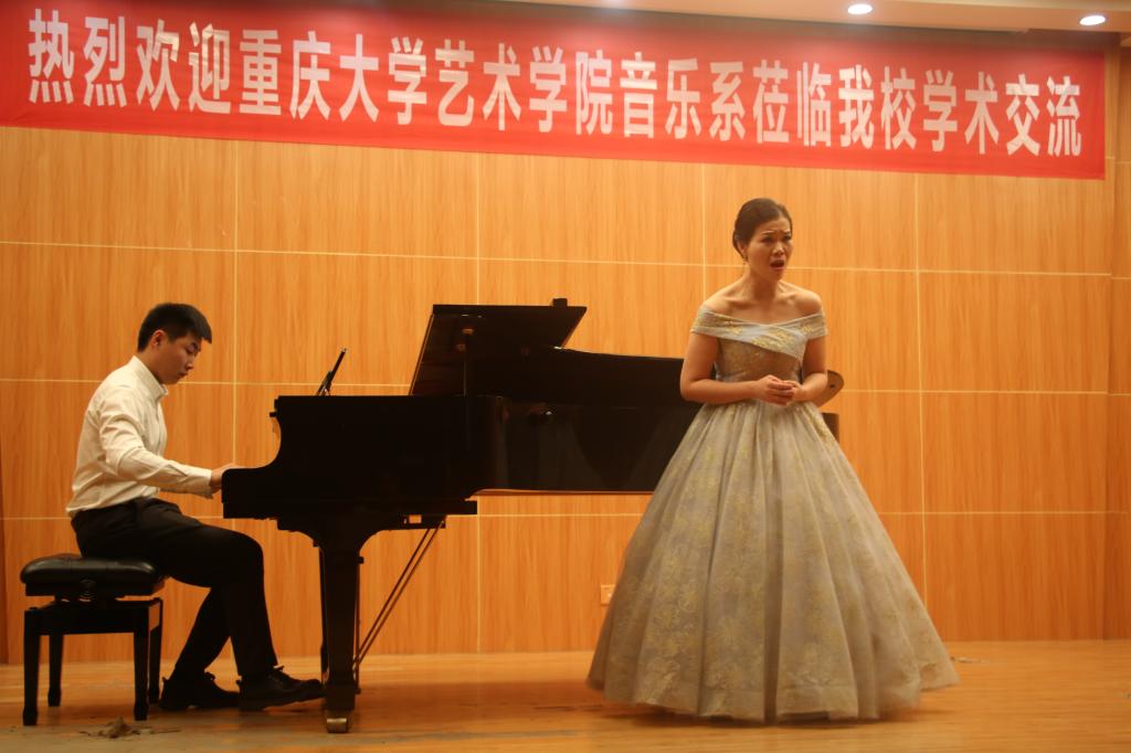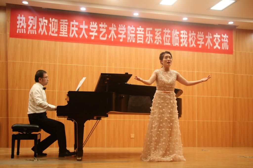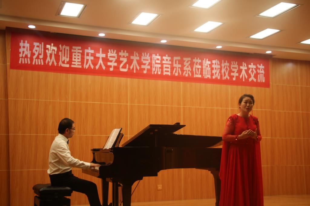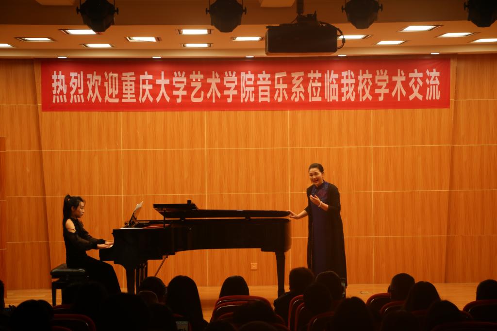 上午,重庆大学艺术学院音乐系主任肖玲教授、副主任喻思言教授分别以《民族声乐歌唱基础与作品风格的建立》、《解析美声演唱技术中的误区》为主题,分享了自己宝贵的教学经验与多年的演唱心得,并对我校音乐教育专业学生进行了现场教学指导,让师生们受益匪浅。不仅从中学到丰富的声乐理论和实践知识,还深深被两位教授对艺术执着的追求所感动,鼓舞师生更加坚信在艺术道路上不断探索和进步的决心。下午,两校师生共同奉献了一场高水品的专场音乐会。重大教授喻思言作为全场音乐导赏,为大家分析讲解关于艺术歌曲、民族声乐、歌剧等音乐知识。两个半小时的演出,不仅让师生们欣赏到精彩的舞台表演,更让大家了解到不同风格、题材声乐作品的艺术内涵,切实提升了音乐艺术素养。