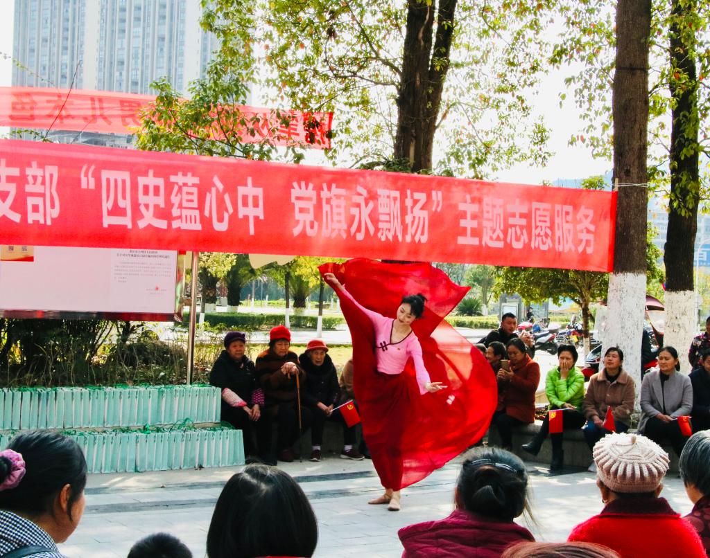 本次主题活动在歌曲《我的祖国》中拉开序幕,各位党员及学生用讲红色故事、演传统曲目、送传统文化等形式把“四史”知识带到群众生活中;党员教师演唱原创歌曲《飘扬的旗帜》,献礼建党100周年。