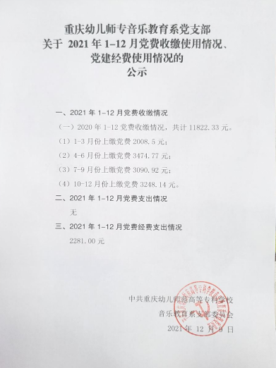 现将音乐教育系党支部2021年党费交纳、使用及党建工作经费使用情况公示如下: