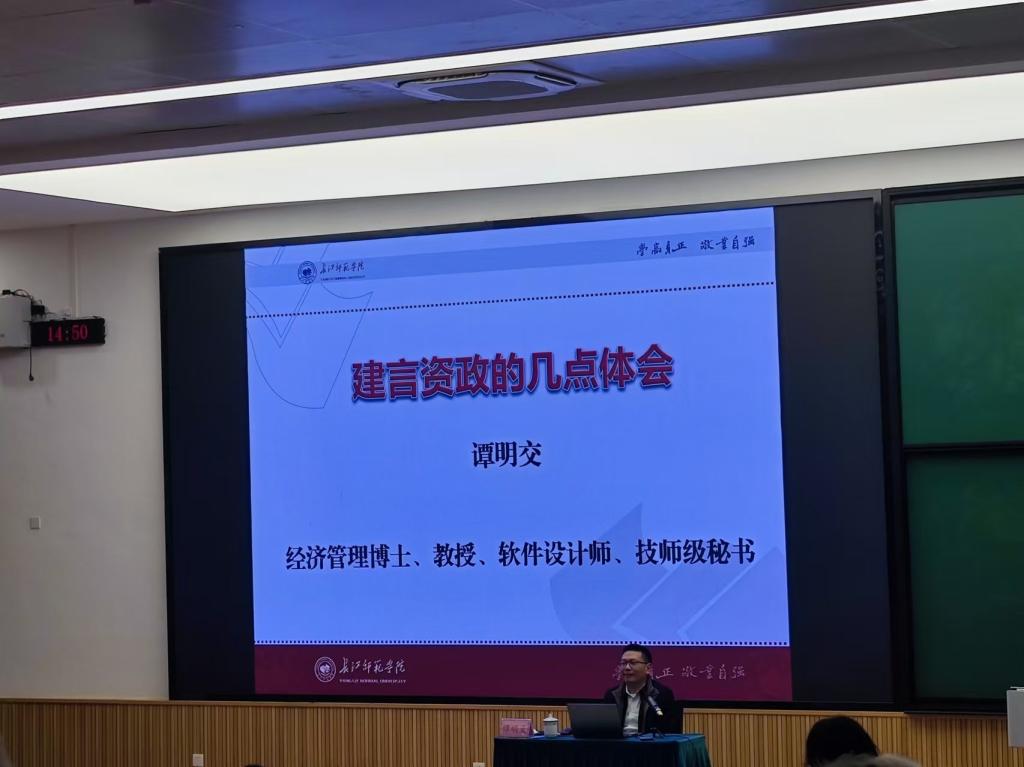 讲座中,谭明交教授以其深厚的学术底蕴和敏锐的政治洞察力,为在座的教师们描绘了一幅建言资政的宏伟蓝图。他从国家发展大局出发,深入剖析了建言资政的重要性和紧迫性,并围绕“国家需要资政”这一核心议题,详细阐述了党员教师在这一过程中的独特作用和使命担当。谭教授指出,作为新时代的教师,不仅要精通专业知识,更要具备高度的政治敏锐性和社会责任感,勇于担当、敢于发声,为党和政府建言献策,为社会发展贡献智慧和力量。