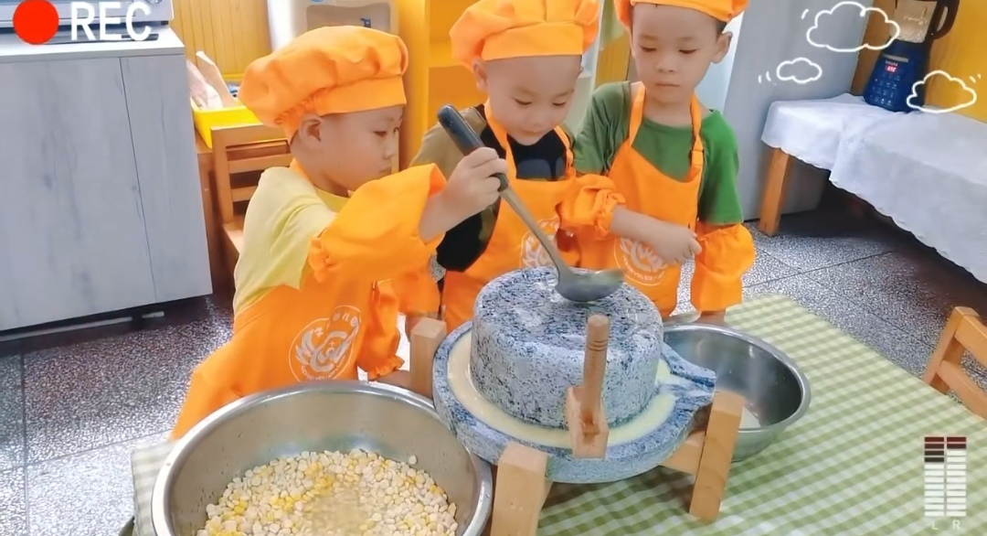 食育课堂。从播种、采摘到烹饪,幼儿全程参与劳动,在动手实践中感悟“一粥一饭来之不易”的深意;
