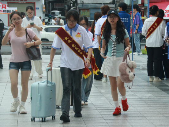 迎新当天上午7时,服务团队早早到岗,完成物资清点、流程复盘等筹备工作,并即刻启动“报到点至宿舍楼”全程护航服务。