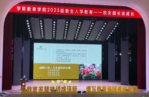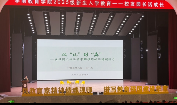 为引导2025级新生尽快融入大学环境、树立专业理想,2025年9月17日,学前教育学院在小湾校区活动中心隆重举行新生入学教育专题活动。本次活动以“校友园长话成长”为主题,特邀重庆市万州区电报路幼儿园教育集团园长熊壮、万州区钟鼓楼幼儿园园长任小燕、万州区上海飞士幼儿园园长杨玲三名我校杰出校友园长重返母校,分享从师范生到卓越园长的成长历程与教育智慧,弘扬教育家精神,强化师范生的使命意识与时代担当。