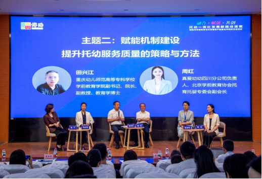 在圆桌论坛环节,田兴江副院长与绵阳师范学院、金苹果咿呀托育园等单位的专家学者,共同围绕“融合路径探讨:如何实现学前教育与托育的有机衔接”“赋能机制建设:提升托幼服务质量的策略与方法”“共创模式探索:构建多方协同的托幼一体化发展生态”三大议题展开深入研讨。田兴江副院长结合我院办学特色和育人实践,重点阐述了项目式教研在人才培养中的创新应用,强调了数字化素养培育的重要价值,并就科技赋能托幼服务提出系列建设性思路,赢得了与会专家的普遍认同,展现了我院在推动区域托幼一体化发展中的专业担当。