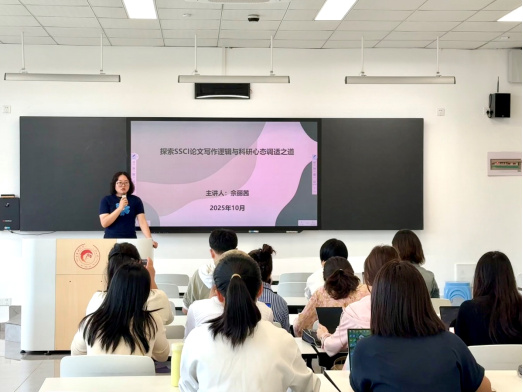 佘博士以《探索SSCI论文的写作逻辑与科研心态调适之道》为题,系统解析了SSCI论文的写作规范与发表要求。她从论文的摘要、引言、文献综述、研究方法、结果与讨论等部分,深入剖析了国际高水平论文的写作逻辑与框架搭建策略,为教师们提供了具有实践指导意义的写作方法。在系统讲解论文写作规范的基础上,佘博士还结合自身丰富的科研经历,着重探讨了科研过程中常见的心态挑战。针对写作拖延、学术焦虑、自我怀疑等突出问题,她分享了科学有效的心态调适方法与应对策略,引导教师建立稳健的科研状态,实现科研能力与心理素质的双重提升。