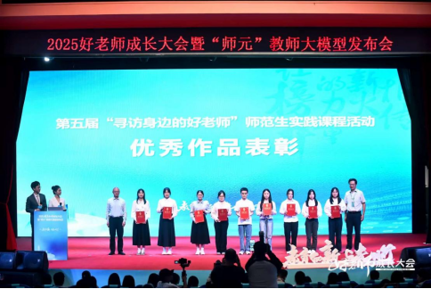 2025年10月18日,2025好老师成长大会暨“师元”教师大模型发布会在西南大学举行。我院专任教师黄俊飞带领5名优秀师范生代表参会。我校党委副书记、校长冉隆锋作为颁奖嘉宾,为优秀师范生代表进行了颁奖。
