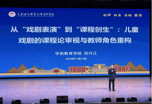 在专题讲座环节,巴渝学者青年学者田兴江博士以《从“戏剧表演”到“课程创生”:儿童戏剧的课程论审视与教师角色重构》为题作学术报告。田博士将儿童戏剧置于课程论核心谱系进行深度解构,系统阐释了儿童戏剧从预设性表演活动向师生共建、动态生成的课程创生过程的转型机制,揭示了经验主义课程观与建构主义知识论的深度融合。他深入剖析了儿童戏剧作为“具身认知”实践场域的内在机理,创新性地提出教师角色应从剧本执行者、技术导演转向课程意义的协同建构者、儿童文化表达的洞察者与反思性实践家。
