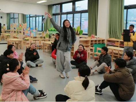 “中文+”文化交流团首先走进了学前教育学院实训基地,观摩由学院师生共同呈现的模拟教学活动,生动展示了以游戏化教学为核心、融合情情境互动与教具操作的中国幼儿园课堂组织模式。学生分组模拟师幼角色,完整展示了从活动设计到评价反思的教学全流程。老挝来宾仔细观摩记录,并就课堂互动技巧、幼儿行为观察等实际问题与现场师生展开交流。活动尾声,来宾们热情融入课堂,与学生共同参与主题互动环节,现场氛围热烈融洽。