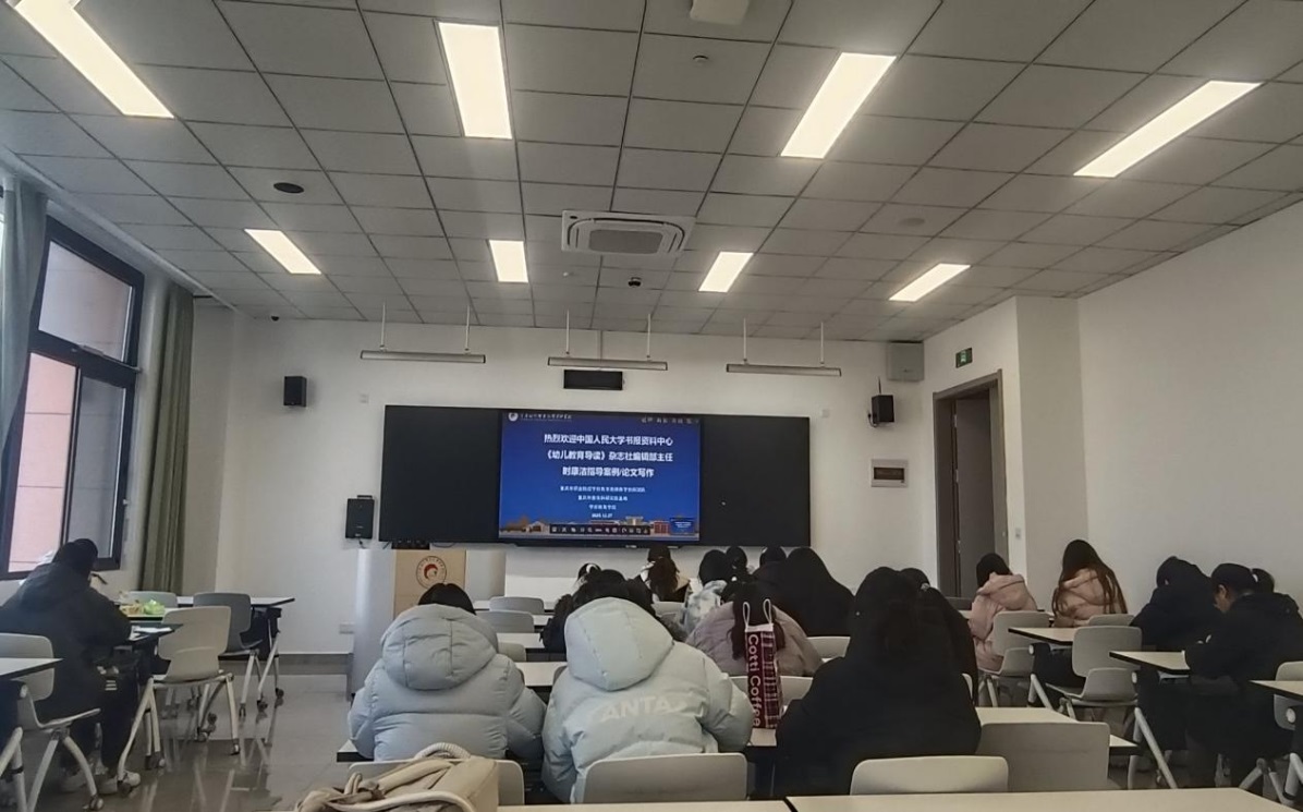 为提升学前教育专业学生科研素养,助力师范生专业发展,学前教育学院于2025年12月27日在敏行楼3401、3403、3405教室举办“由教育教学问题到论文/教育案例撰写的逻辑与方法”专题科研指导活动。本次活动特邀中国人民大学书报资料中心《幼儿教育导读》杂志社编辑部主任时康洁担任主讲人,由青年干部处级岗位锻炼人选徐浩主持,2023级学前教育学生及部分教师近两百人线上线下共同参与。