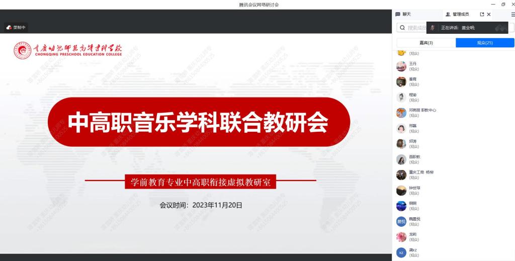 2023年11月20日我校学前教育专业中高职衔接虚拟教研室第一次线上教研会——中高职音乐学科联合教研会在腾讯会议顺利开展。本次参会人员有儿童早期发展学院工作小组:任捷,盖业明、邢磊、谭雪娇、陶孟壕及学前教育(两年制)专业团队成员;重庆幼儿师专音乐学科教师:吴春花、程渝、任利容;酉阳县职教中心、渝中区职教中心、开州职教中心学校专业负责人及音乐学科相关41名教师。