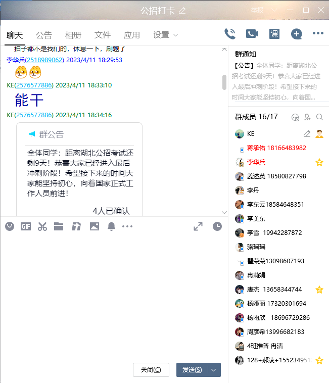 4班的李东云是这次唯一一名进入体检的男生,虽然他的专业基础并不突出,但是他和其他备考的同学一样,心中有一个坚定的信念:我一定要当一名优秀的幼儿教师!即使不考公招,我也会继续走学前教育的专业之路!他在参加公招之前已经联系好就业单位,但是在未毕业前,他希望自己能够通过自己的努力做更多尝试。在教师资格证复习、专升本复习和公招考试的路上,辅导员专门建了一个打卡群,让同学们自己制定每天的学习任务,每天在规定的时间内将学习任务和学习照片或视频打卡发到群里,对不能坚持到底的同学采取“裁员制”,所以群里的人数在不断减少,李东云同学很庆幸,自己是坚持到最后的为数不多的几名同学。