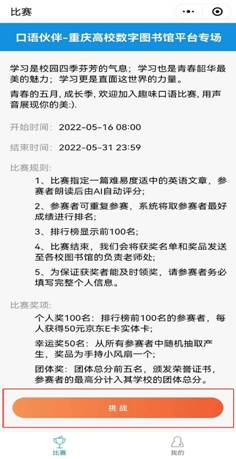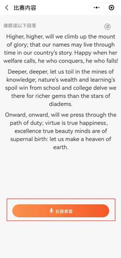 2、比赛系统将提供一篇难易度适中的文章供参赛者朗读,参赛者完成整段朗读后,系统将给出评分。参赛者可进入“再次挑战”反复参赛,最高分将进入系统排名。