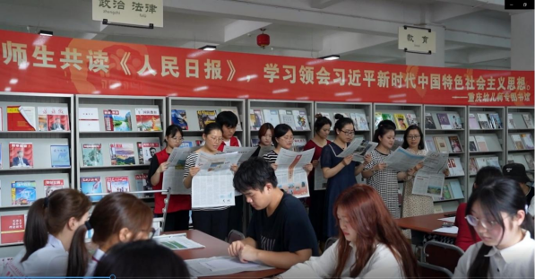5月29日,来自马克思主义学院、各二级学院的师生代表齐聚图书馆,查阅《人民日报》专架,展开了自由阅读、教师精读、师生共读等读书活动。师生们对《写在大地上的奋斗之歌》《勇敢肩负起时代赋予的重任——以奋斗姿态激扬青春》《总书记心中的新时代好青年》、《每个人都了不起——总书记的人民情怀》等十余篇原文进行了形式多样的诵读,师生们用饱满的精神、真挚的情感、铿锵的节奏,在领诵、分诵、齐诵的朗朗读书声中,领悟精神,进一步学习领会习近平新时代中国特色社会主义思想的世界观和方法论。活动充分发挥了辅导员、思政课教师的主动性、积极性,鼓励、引导学生自觉运用贯穿其中的立场、观点、方法观察时代、把握时代,分析问题、解决问题,扎实推动了习近平新时代中国特色社会主义思想进教材、进课堂、进头脑。