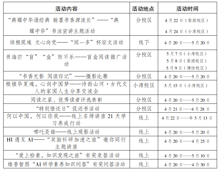 党的二十大报告明确提出“深化全民阅读活动”。为深入贯彻落实习近平总书记致首届全民阅读大会贺信精神,坚持“阅享新时代”文化理念,做好新征程、新幼专全校文化阅读推广工作,喜迎第30个“世界读书日”。学校图书馆以习近平新时代中国特色社会主义思想为指导,开展“书香新程 阅见未来”读书月系列活动。希望三校区的师生都参与到阅读中来,形成爱读书、读好书、善读书的浓厚氛围,并在读书活动中,为精神打底,为人生奠基,与经典为友,与博览同行,开拓广阔视野,创建学习型校园,促进全校师生素质的全面发展。