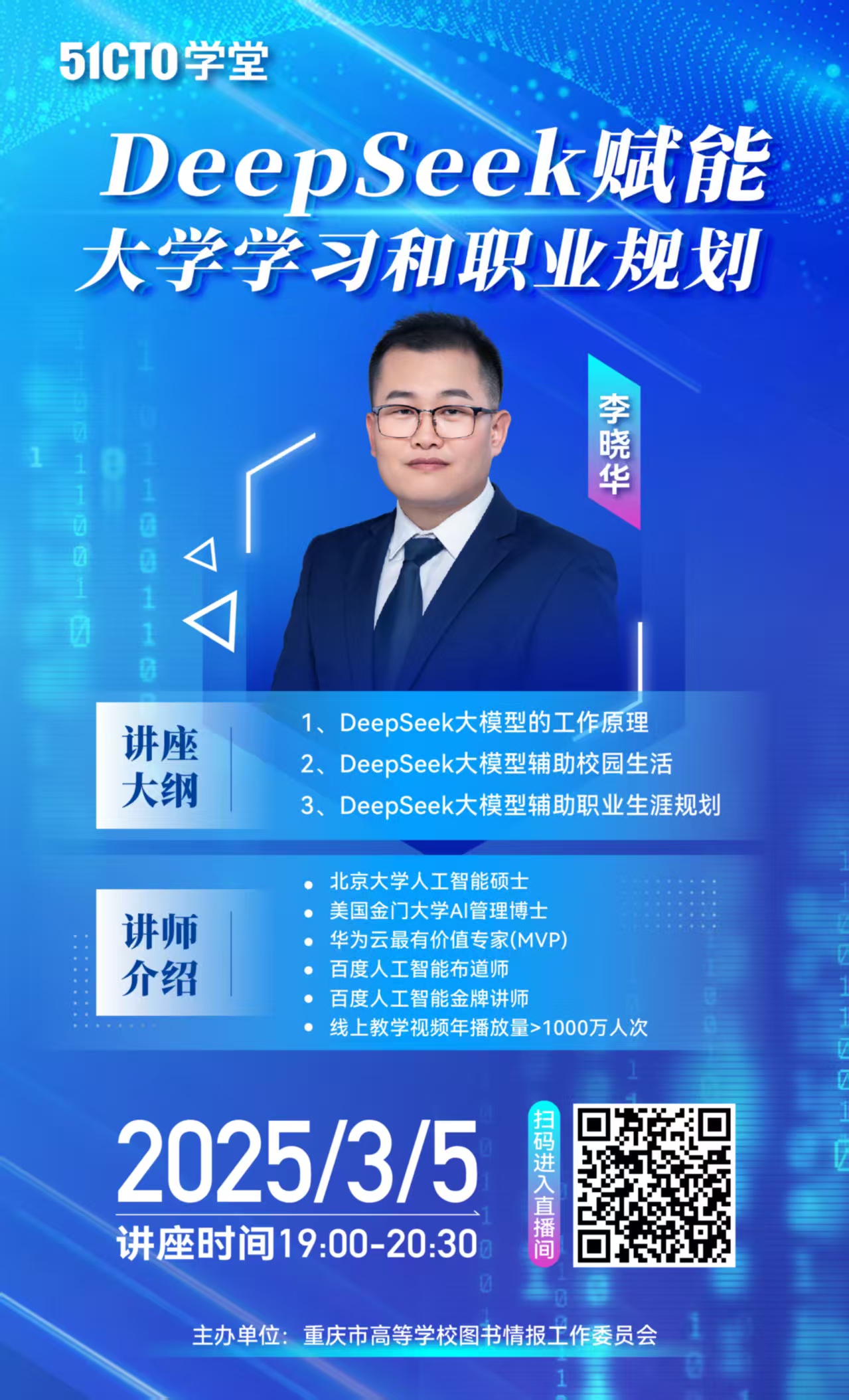 今年图工委将联合重庆高校数字图书馆共享平台的数据公司面向高校师生开展线上讲座等宣传活动,2025年3月5日(周三)19:00的线上讲座内容是:“Deepseek 赋能大学学习和职业规划”,欢迎我校师生积极参加!