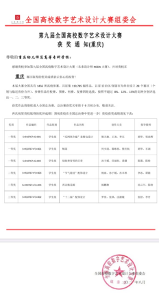 近期,美术教育系多名教师指导学生参加“第九届全国高校数字艺术设计大赛”喜获佳绩。胡华、邹尚辉带领学生勇获全国二等奖;胡华、石涧,陈晗、陈愚带领学生分别斩获市级一等奖两个;李冰、谭婧,沈云川、陈晗带领学生分别荣获市级二等奖两个;张舒、李丹带领学生获得市级三等奖一个。