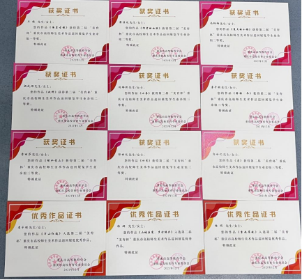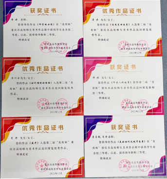 近期,在第二届“美育杯”重庆高校师生美术作品巡回展览中,我院选送的多件美术作品喜获佳绩,师生斩获各级奖项共计52个。其中教师组刘成林、李冰作品荣获二等奖;周伟、谭婧作品荣获三等奖;石川安、任孟均、邹尚辉、李丹、胡华、肖丹作品荣获优秀奖。学生组作品荣获一等奖1个,二等奖5个,三等奖6个,优秀奖11个,入选展览佳品7幅。