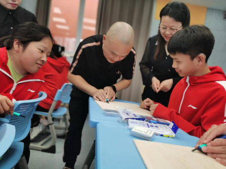 活动中,我院教师团队首先同校方就教学实践中的问题和困惑各抒己见,共同交流教学工作经验,商讨改进措施;随后通过故事导入、师生探讨、示范实践等方式为学生献上了一堂爱心版画公开课,与会兄弟院校美术教师全程听课,共同参与版画制作,对我院教师团队展现出的教学能力、水平给予高度评价。