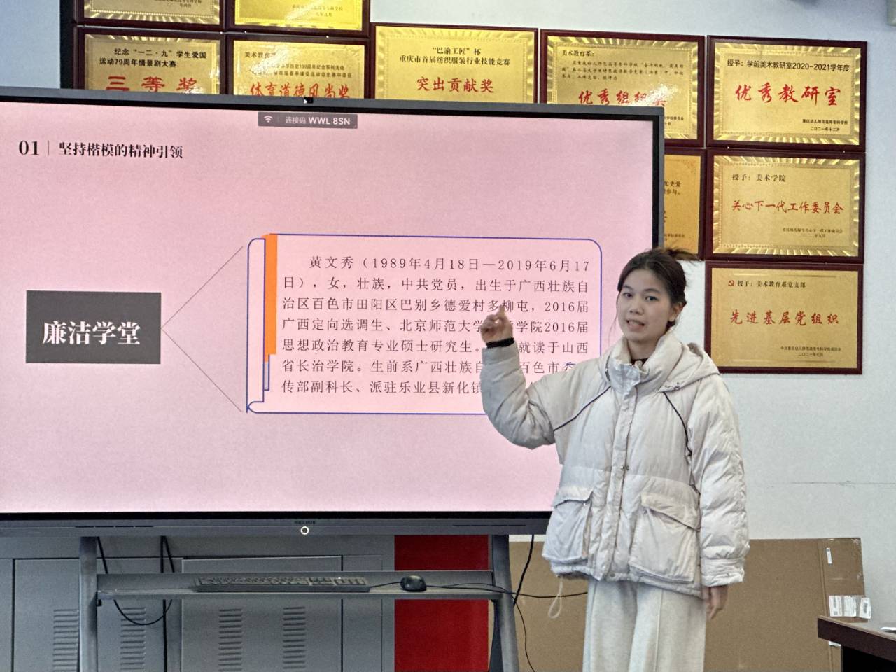 为深入学习贯彻习近平总书记关于党风廉政建设和青年作为的重要论述,倡导树立“知廉、敬廉、践廉”的良好风尚,推进青年的廉洁教育工作开展,提高青年思清廉、悟清廉、行清廉的意识,引导学生向清廉榜样学习,扣好“第一粒扣子”,12月7日中午,美术学院于仁爱楼507会议室举行“青春倡廉”学习研讨会,学院第九届、第十届学生干部、各班级学生代表参加本次会议。