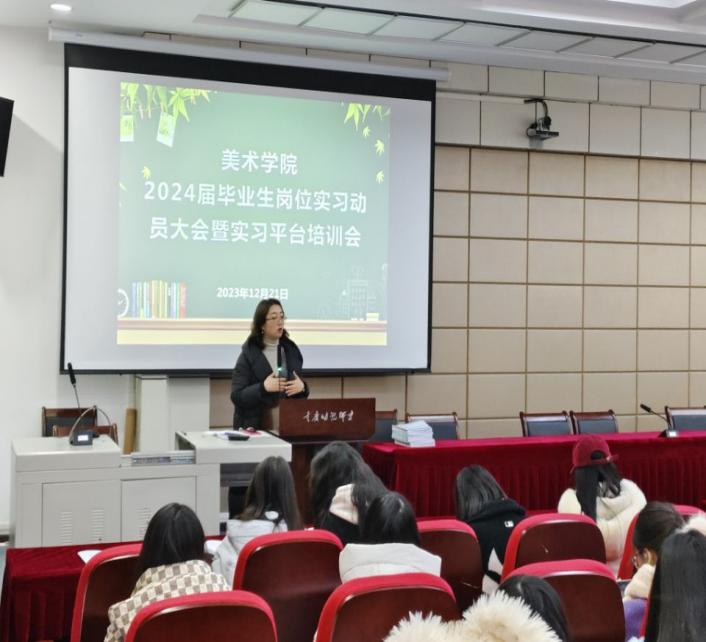 为推进实习工作的顺利开展,引导美术学院各专业学生树立正确的实习观念,提高学生教学实践能力,2023年12月21日,美术学院2024届实习动员会在仁爱楼一楼就业宣讲大厅召开。全体实习生、实习指导教师、教学秘书彭科霞参加会议,会议由教学科研办公室副主任蔡梦玲主持。