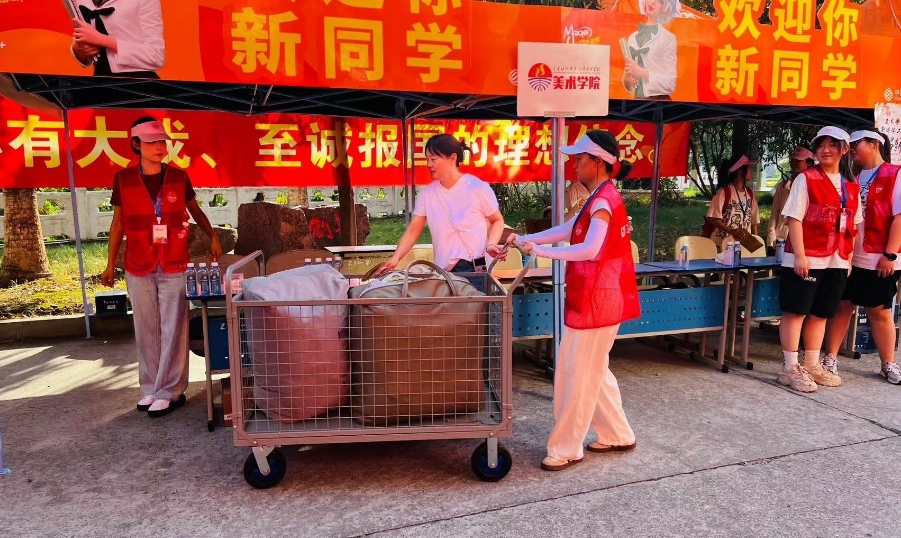 炎炎烈日,也不能阻挡志愿者们迎接新生的热情。迎新当天,校园大道迎新点,一群身着统一服装的美院迎新志愿者们忙碌地穿梭于人群中,热情的师兄师姐汗流浃背,肩扛手提帮助学弟学妹将行李运往宿舍,让萌新们感受到家一般的温暖。从路线指引、信息咨询到行李搬运,志愿者们的辛勤付出和微笑脸庞,让新生感受到了青春的正能量,一幕幕温馨感人的迎新画面在校园里真情呈现。