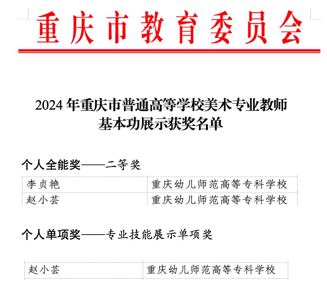 近日,重庆市教育委员会公布了2024年重庆市大中小学音乐美术教师基本功展示获奖名单。我院青年教师李贞艳、赵小芸在活动中分别荣获个人全能二等奖,赵小芸另获个人专业技能展示单项奖。