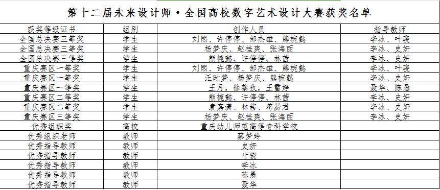近日,第十二届未来设计师·全国高校数字艺术设计大赛获奖名单公布,在李冰、叶骁、陈愚、聂华、史妍等老师的指导下,我院学子在本次大赛中表现卓越,收获颇丰,共获得全国总决赛三等奖3项;重庆赛区一等奖3项、二等奖2项、三等奖1项;优秀组织老师1项、优秀组织奖1项、优秀指导老师5项。