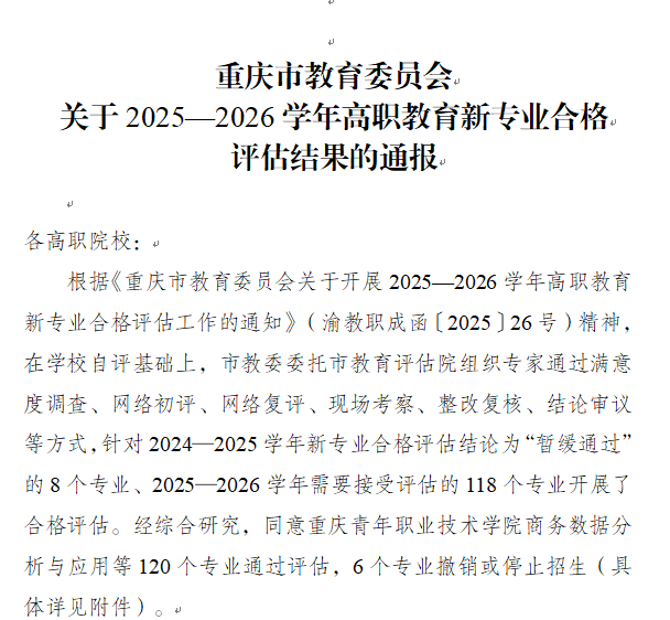 近日,重庆市教育委员会发布了《关于2025—2026学年高职教育新专业合格评估结果的通报》(渝教职成发〔2025〕58号),学院人工智能技术专业顺利通过评估。