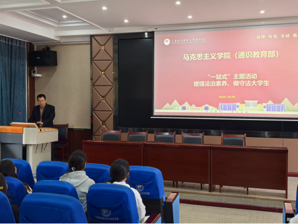 为深入贯彻落实全面依法治国的基本方略,加强校园法治文化建设,切实提升大学生的法治意识和法律素养,引导广大学生争做尊法、学法、守法、用法的新时代青年。2025年10月29日,马克思主义学院(通识教育部)教师在云阳梨园校区成功举办了“增强法治素养、做守法大学生”法治宣传主题教育活动。