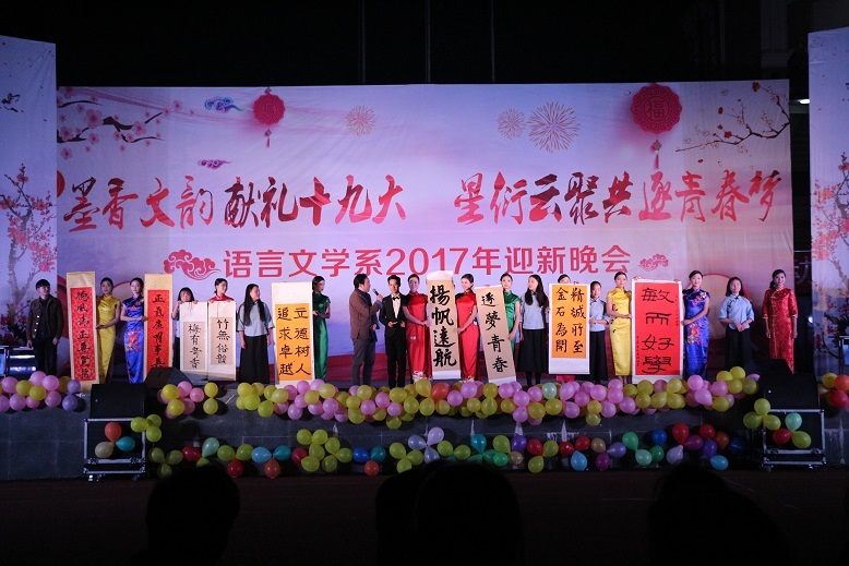 12月21日,语言文学系在沙河校区举办了“献礼十九大,共逐青春梦”主题“迎新”晚会。主持党委工作副书记校长柳卫东、副校长陈冬梅、党委委员正校级干部冯李平、各处室系部党政相关负责人、沙河校区师生3000余人观看演出。